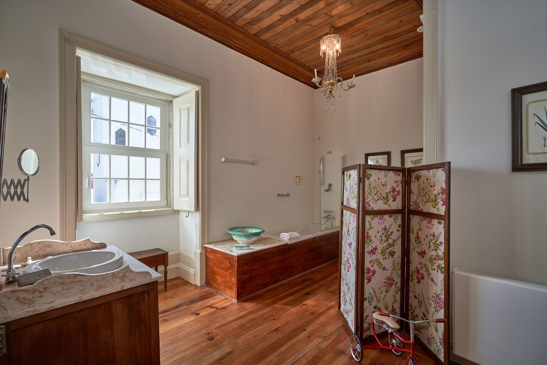 O toque clássico do mobiliário e a área generosa deste quarto transporta-nos para outras eras plenas em elegância e sobriedade. O salão de banho acompanha este cenário único.