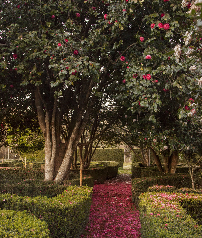 Serpentear pelos labirínticos buxos, sombreados por cameleiras centenárias, que desprendem suavemente pétalas de camélias, oferecendo um tapete em tons rosa com um perfume floral.