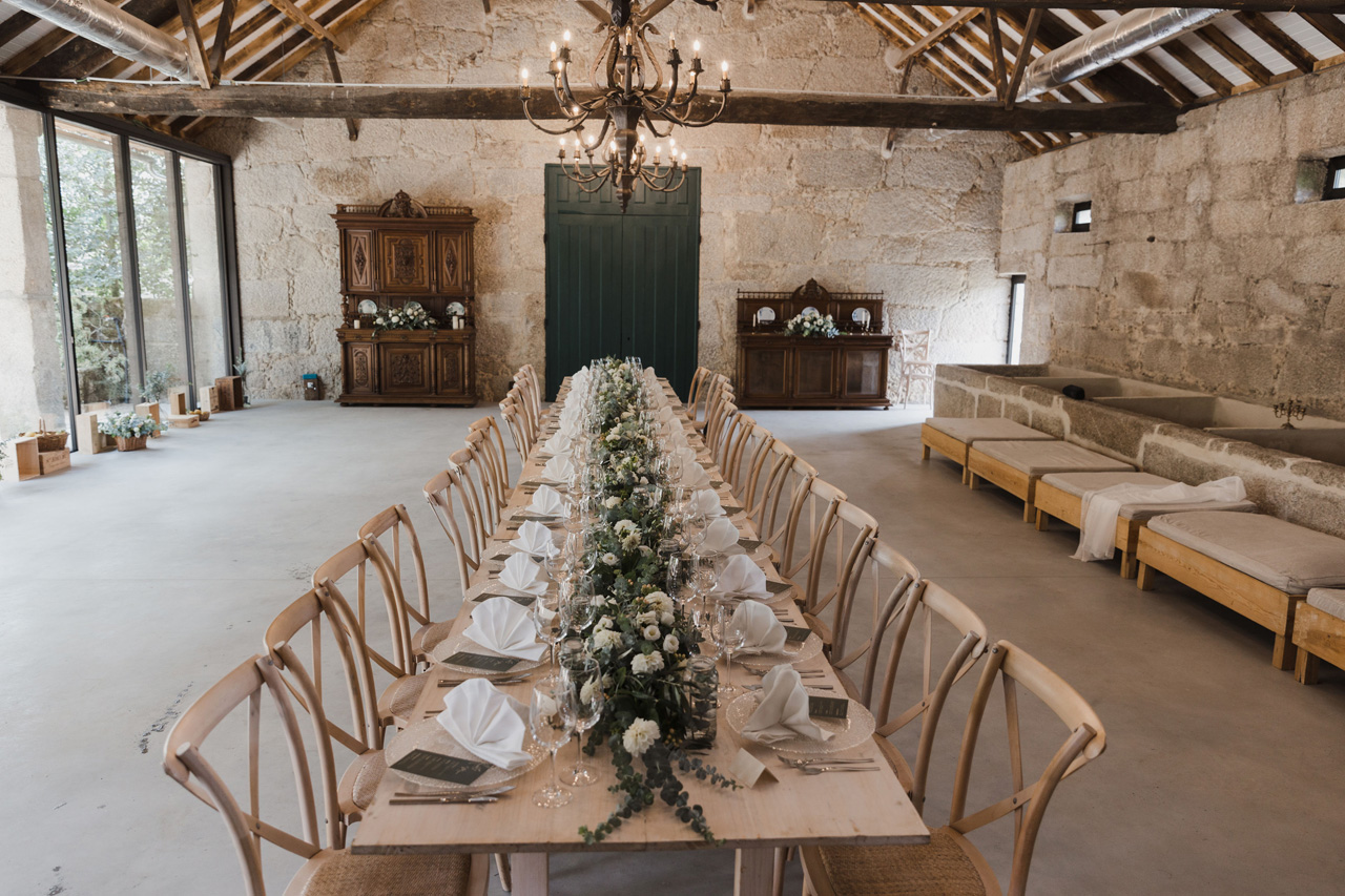 A natureza bucólica envolve os passos até ao nosso salão de eventos, localizado num antigo armazém onde as azeitonas eram transformadas em ouro líquido. Este espaço é um abraço do granito, combinando tradição e elegância. A transparência e versatilidade da área, permite que os jardins entrem culminando numa sensação de luminosidade, os tetos altos sustentados por grossas asnas de madeira, elevam o olhar e ampliam o salão. A espreitar por um janelão rasgado no granito, antevemos a cozinha equipada ao mais alto nível, o apoio ideal para que o nosso chef exclusivo se motive a trazer a melhor qualidade e criatividade gastronómica às mesas dos nossos eventos.